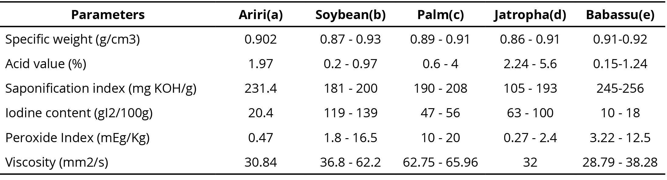 Therefore, because it has physicochemical characteristics within the typical ranges of vegetable oils, ariri coconut oil presents a viable alternative for enzymatic transesterification, especially if acidity-related issues are adequately addressed.