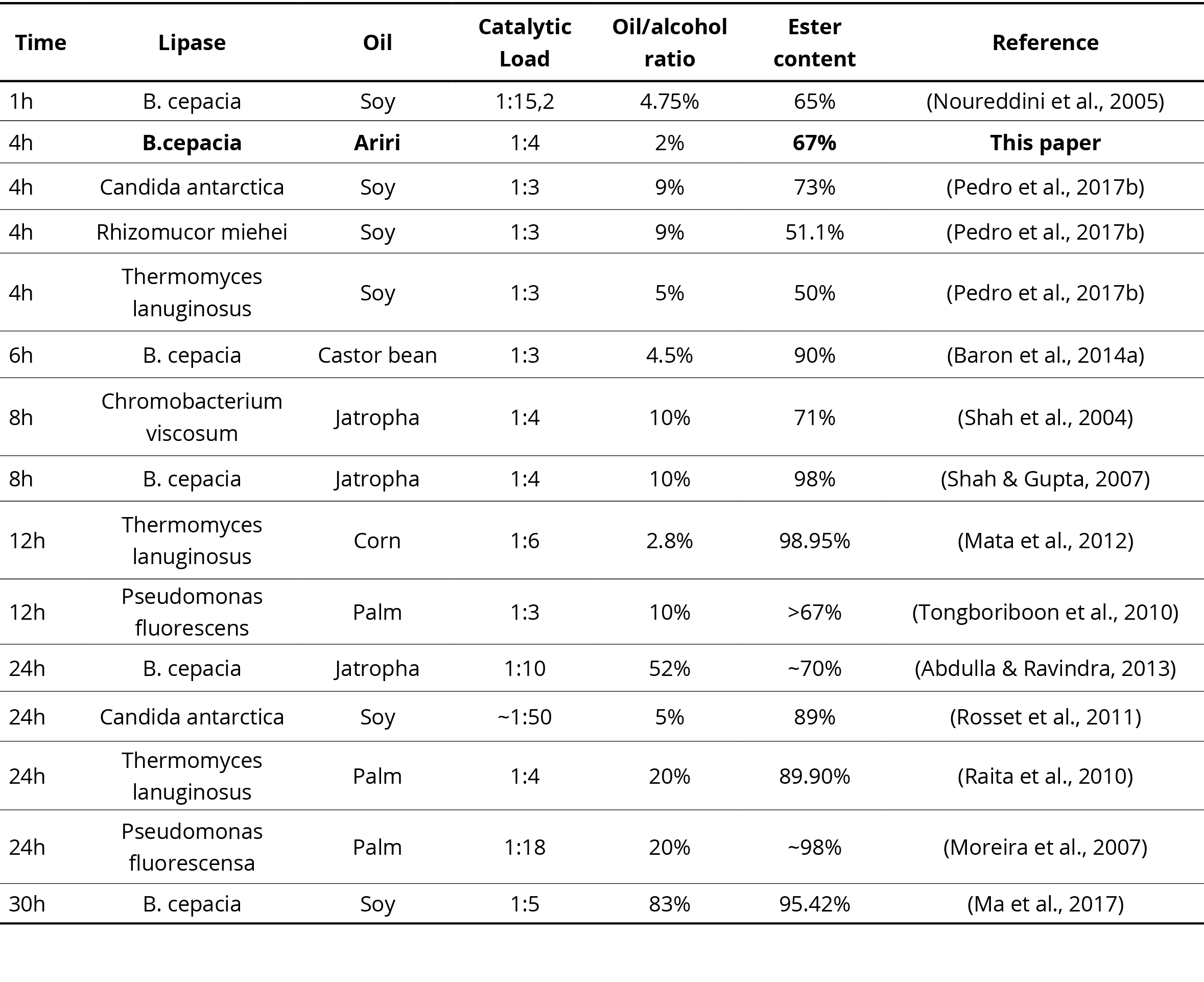 It is worth noting that optimisations can occur in different molar ratios. Baron et al. (2014) achieved the best results with the oil/ethanol molar ratio of 1:3, while Mata et al. (2012) obtained a 1:6 ratio while Moreira et al. (2020) obtained the molar ratio of 1:18, that is, there is no oil/ethanol molar ratio that can guarantee a greater amount of esters, because this will depend on the type and form of the lipase, the catalytic content, the reaction time, among others (Baron et al., 2014a; Mata et al., 2012; K. S. Moreira et al., 2020).