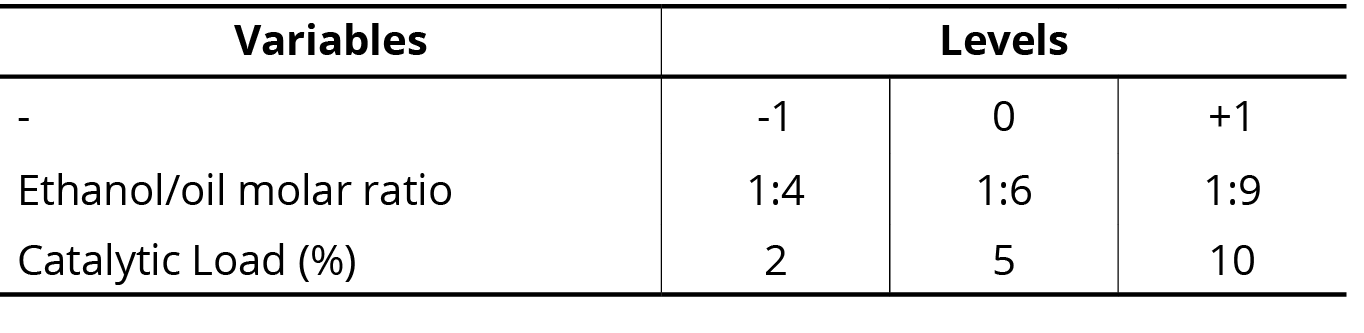 Transesterification reactions that use lipases as catalysts are carried out using different methodologies, so each researcher evaluates which parameters need to be verified. In this context, the complete factorial design 32 was used, with the following variables being the oil:ethanol ratio and the catalytic load. For each variable, three levels were considered: oil/ethanol ratios 1:4, 1:6, and 1:9, and catalytic loads of 2%, 5%, and 10%. The reaction time was kept constant at 4 h.