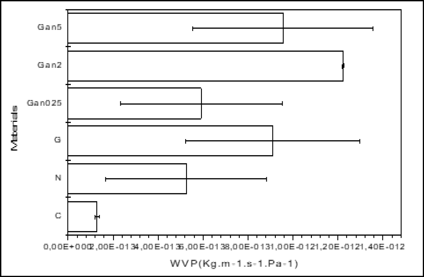 Water vapor permeability (WVP) analysis determines the potential of a package to inhibit the passage of water in gaseous form (Shaikh et al., 2019). In this case, the analysis revealed no statistically significant differences between the results, as shown in Figure 5. However, the films containing rGO exhibited a higher permeability to water vapor.