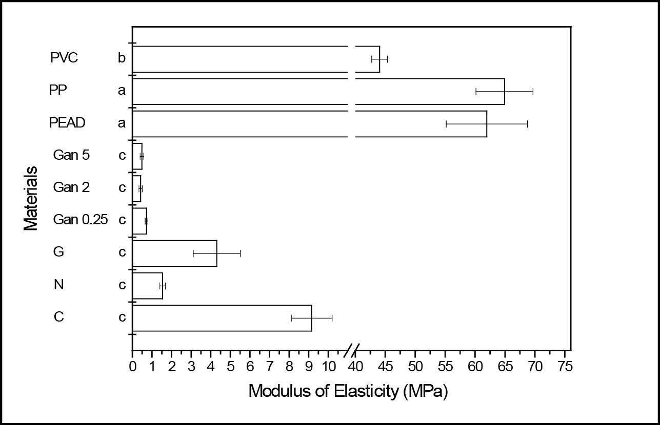 Figure 2 – Graph of the modulus of elasticity of the films produced compared with commercial materials