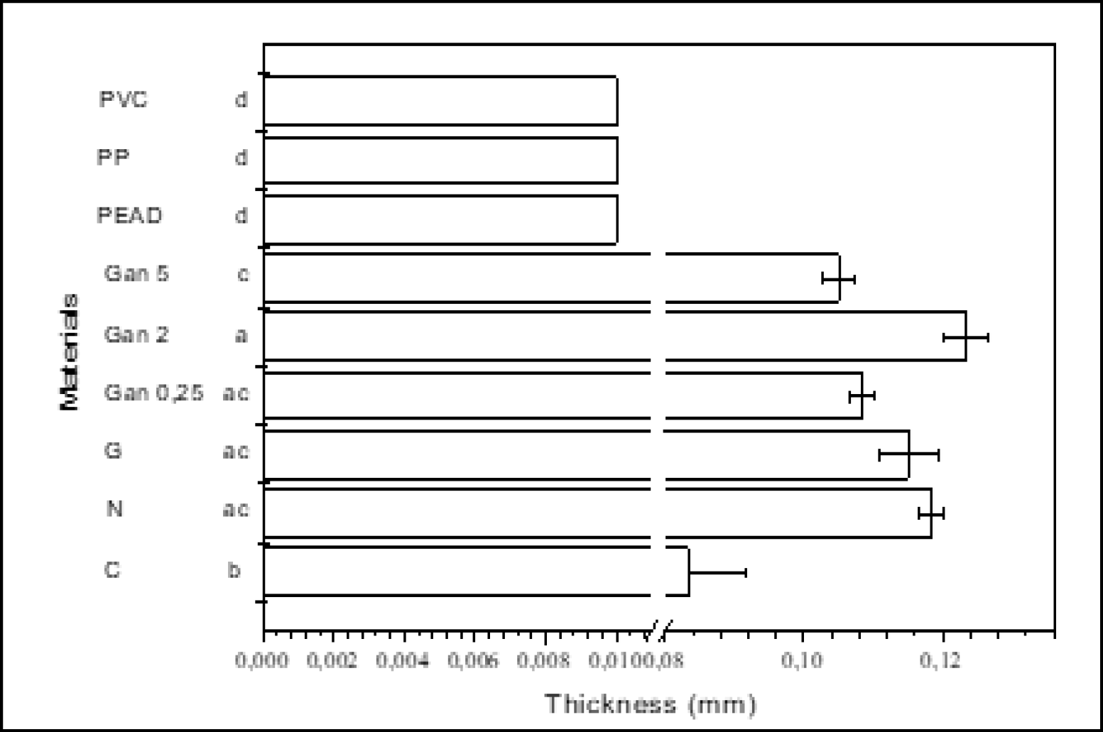 Figure 1 – Graph of the average thickness of the films produced compared to traditional commercial polymers