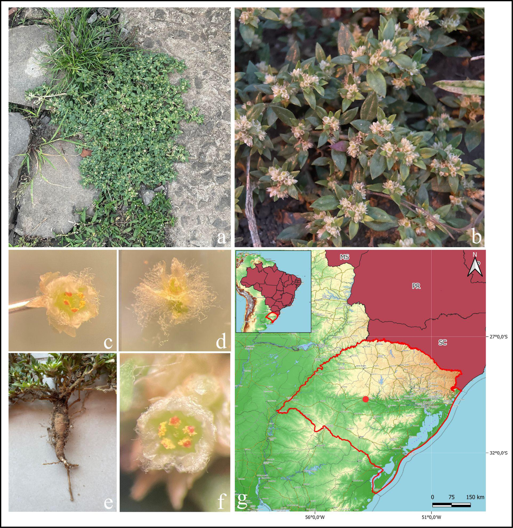 Figure 1 – Guilleminea densa: a new record for Brazil. a. Habit. b. Branches with flowers. c and d. Flower details from above. e. Tuberous root, characteristic of the species. f. Flower detail, with pollen on the anthers. g. Location map of the record