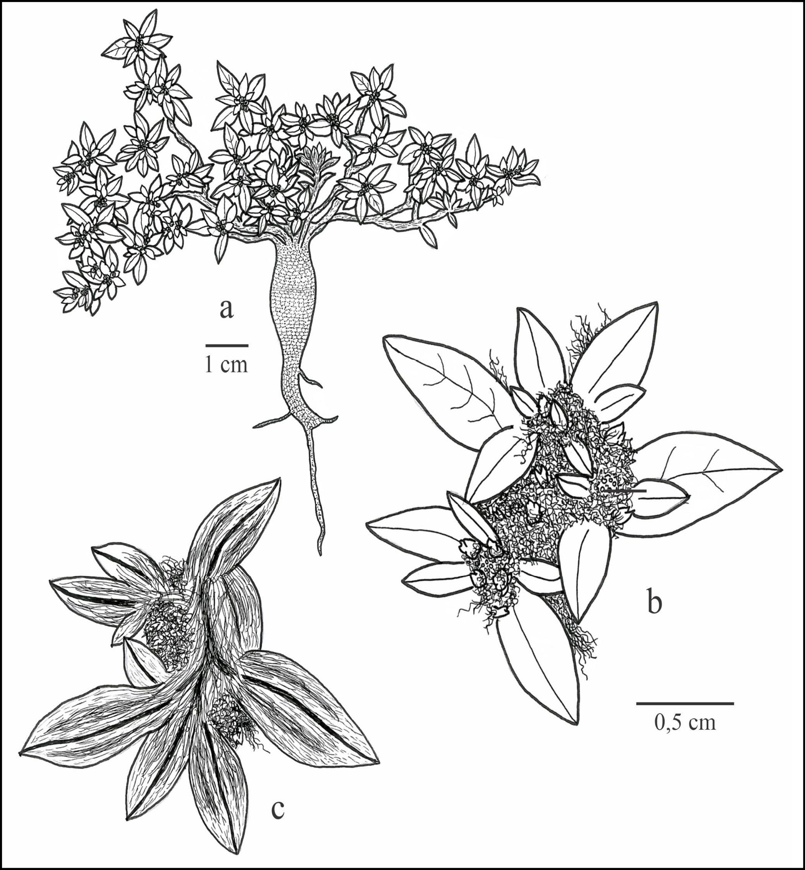 Figure 2 – Guilleminea densa: a new record for Brazil. Illustration a. Habit b. Adaxial surface appearance of leaf blades. c. Abaxial surface appearance