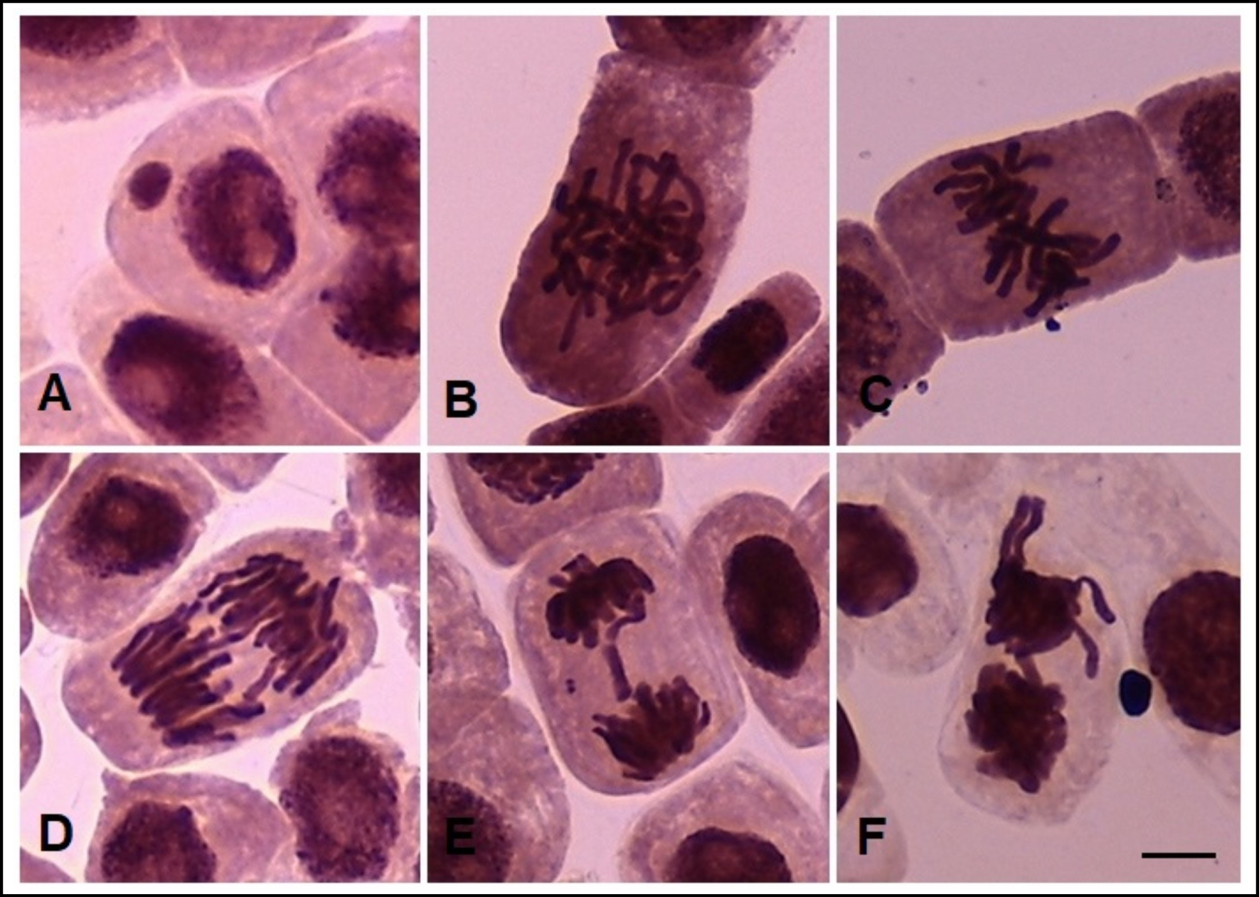 2.1 Thyme cultivation The experiment was installed in an adapted greenhouse with fertigation system, located in the Department of Plant Science, Federal University of Santa Maria (UFSM). Santa Maria is a city with Cfa climate (humid subtropical, with hot summer, and sometimes drought), according to Köeppen (Alvares et al., 2013), located in the center of the state of Rio Grande do Sul, 95 meters above sea level, having as characteristic the clear division between seasons. One hundred Thymus vulgaris L. seedlings, produced by cuttings, were grown in pots filled with commercial Maxiplant® substrate, in two seasons, winter ٢٠١٨ (june-august) and summer 2018/2019 (december-january). The pots were on benches, inside a low-density polyethylene greenhouse with a thickness of 100 μm. Nutrient solution was supplied to the plants through a drip tape connected to a submerged pump inside a reservoir. A timer was used to schedule the supply time of the nutrient solution (three times a day). The drained solution was collected and then returned to the original reservoir in a closed system. After 60 days in the greenhouse during the winter, the plants were collected. In order to measure the effects of seasonality, the material was collected on the day that marked the mid-season (August 06, 2018). The heat sum for the 60 days that the plants remained in the greenhouse during the winter was calculated. For the summer experiment, the sum temperature of the winter was used to define the day of collection of the plants, which was when the sum temperature of the summer reached a value close to that of winter (January 9, 2019). 2.2 Essential oil extraction and dilution The essential oil of thyme was extracted in the Laboratory of Plant Cytogenetics and Genotoxicity (LABCITOGEN) of the Department of Biology. Immediately after collection, the fresh mass (FM) was determined by weighing 20 whole plants on analytical scales. Next, 50 grams (g) samples of fresh plants were weighed and frozen for later extraction of essential oil. The hydrodistillation method was performed using a Clevenger apparatus for two hours, with 50 g of fresh-frozen thyme. After extraction, the EO was collected in the form of supernatant, deposited in an amber flask, weighed on an analytical balance, identified and stored at 4°C ± 2°C until its use. Dilution of the EO was performed with absolute ethanol, obtaining concentrations of 0.10% and 0.25%. Oil samples were analyzed by gas chromatography to determine the phytochemical composition. 2.3 Allium cepa test Cytogenotoxicity analysis was performed using the A. cepa test, which consists of examining meristematic cells from onion roots to determine mitotic indexes and to look for chromosomal changes. For the test, seven groups of four onion bulbs (repetitions) were placed in distilled water until they emitted roots. After root emergence, each group of four onion bulbs was transferred to one of the following treatments: controls (negative control = distilled water; negative control relative to oil dilution = ethanol; and positive control = glyphosate) and diluted thyme EOs, where they remained for 24 hours. The detailed description of the treatments and controls used in this experiment is shown in Table 1. Table 1 – Treatments used in the evaluation of the cytotoxicity and genotoxicity of the essential oil of Thymus vulgaris, by the Allium cepa test Treatment Description T1 Negative control in distilled water (NC) T2 Negative control in ethanol (NCE) T3 Positive control in 2% glyphosate (PC) T4 Essential oil (0.10%) - extracted from fresh-frozen thyme plants cultivated in winter (EO010W) T5 Essential oil (0.10%) - extracted from fresh-frozen thyme plants cultivated in summer (EO010S) T6 Essential oil (0.25%) - extracted from fresh-frozen thyme plants cultivated in winter (EO025W) T7 Essential oil (0,25%) - extracted from fresh-frozen thyme plants cultivated in summer (EO025S) Source: Organized by the authors After the treatment period, all roots were collected, fixed in ethanol: acetic acid (3:1 ratio) for 24 hours, and stored in 70% ethanol under refrigeration. The slides for the analysis of meristematic cells of A. cepa roots were prepared according to the crushing method (Guerra & De Souza, 2002), with minor modifications (Pereira et al., 2022). For each treatment, two slides were prepared (repetitions). Under a Leica optical microscope, the slides were examined by the scanning method at 40X magnification. In each slide, 500 cells were analyzed, totaling 1000 cells per bulb and 4000 cells per treatment. The meristematic cells were classified according to the stage of cell division in which they were found (interphase, prophase, metaphase, anaphase and telophase), for subsequent calculation of the mitotic index (MI). The MI was calculated by the ratio of the number of dividing cells by the total number of cells analyzed and multiplied by 100. Any chromosomal irregularities were also counted and photographed. The genotoxic index (GI) was calculated by the ratio of the number of cells with alterations by the total number of cells analyzed and multiplied by 100. 2.4 Chemical analysis of the essential oils The chromatographic analysis was performed in the Laboratory of Plant Extractives (LABEVE) of the Department of Forest Sciences at UFSM. For the analysis, an aliquot of 2 microliter (μL) of essential oil was diluted in 1 mL of hexane (HPLC grade) in duplicate. The chemical composition of the EO was determined using an Agilent 7890A gas chromatograph coupled to a 5075C mass spectrometer (GC-MS) with a non-polar DB5-MS capillary column (Hewlett Packard, 5% phenylmethyl siloxane, 30 m × 0.25 mm i.d. × 0.25 µm film thickness), electron ionization mode at 70 eV. Helium was the carrier gas (1.0 mL·min-1), injector and detector temperatures of 150°C and 280°C were used, respectively. The samples were injected in split inlet mode (ratio 1:100). The oven was heated at 40 °C for 4 min