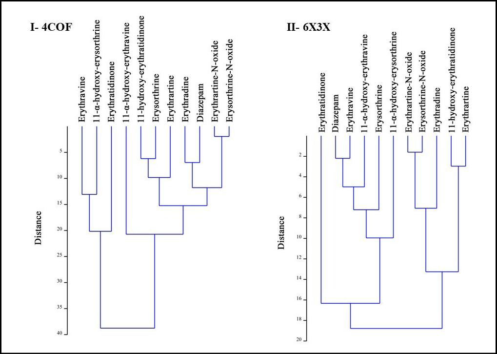 Considering that all the molecules studied showed a strong correlation among the interactions, it is possible that the anxiolytic, hypnotic, and sedative actions are presented more effectively by the complete set of molecules. Flausino (2007) observed that the pure alkaloids did not alter escape latencies in the elevated T-maze. This possible synergistic action of the alkaloid molecules can be visualized by analyzing the dendrograms and HCA (Figure 2-3), where it is possible to see a major part of the molecules interacting in a very similar way with diazepam in the residues of the active sites, sugesting that sinergic interaction of erithrinic alkaloids group.