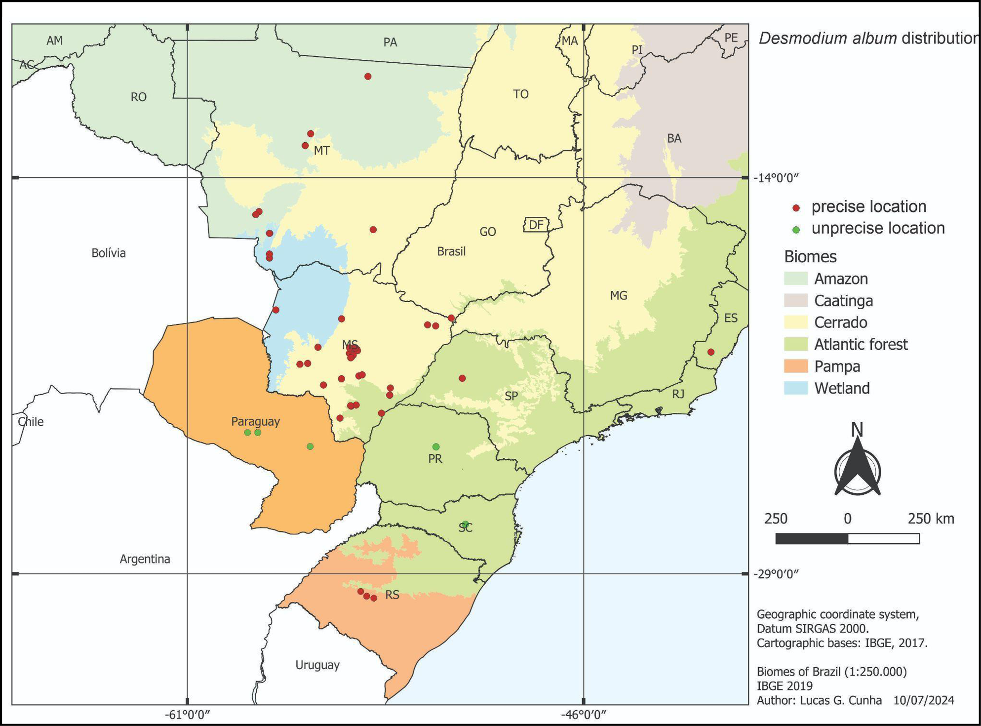 Collections with accurate locations (red points) were plotted using SpeciesLink (2024) data, and those with imprecise locations (green points) were represented by PR and SC centroids. Figure 1 illustrates that our new Desmodium album collections represent the first record of this species for RS and in the Pampa biome.