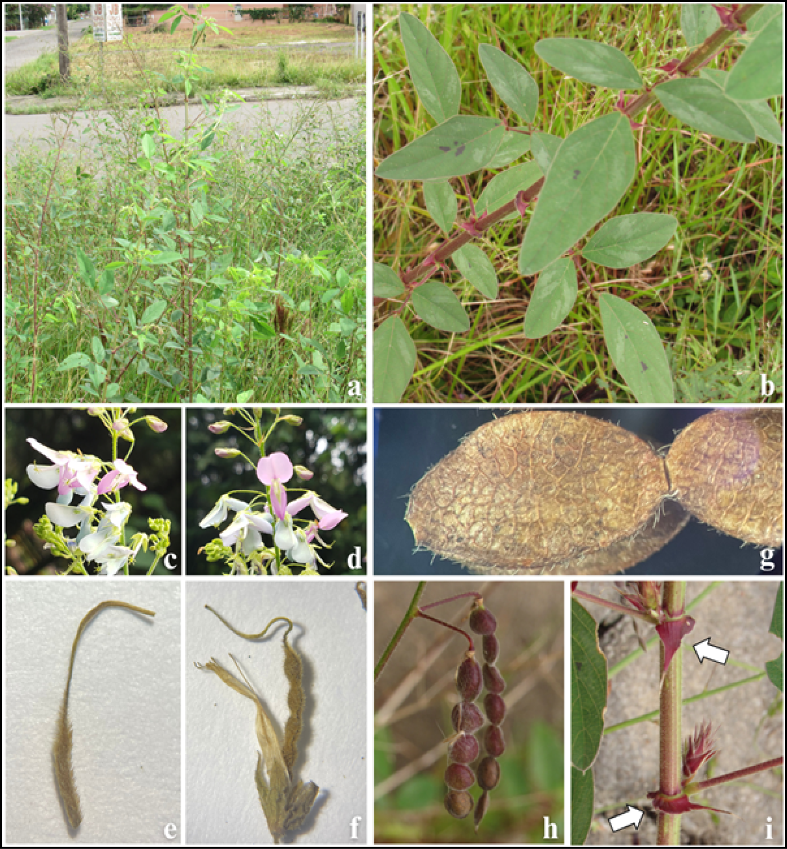 Figure 2 – Desmodium album (Schindl.) J.F. Macbr. a. Habit. b. Branches with leaves/leaflets. c-d. Flowers. e-f. Immature gynoecium. g-h. Fruits. i. Stipules. (Authors: A, B, H e I Vogel Ely, C.; C e D Silva Filho, P.J.S.; E-G Cunha, L.G.)