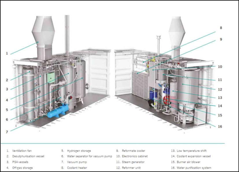 In January 2024, some of these manufacturers were consulted, including Hygear. The Hy.GEN 300 processor, available as a modular option in Hygear’s portfolio and utilizing SMR, WGS, and PSA technologies, produces up to 300 Nm³/h of H2 with a purity of 99.6.