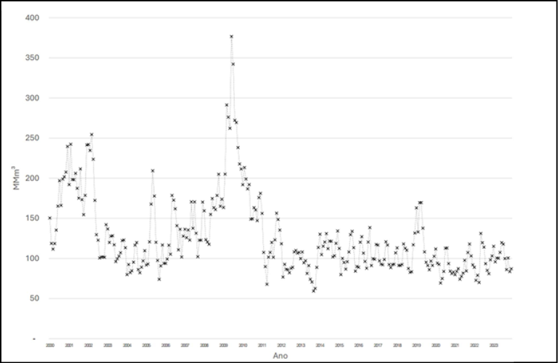 Initially, the methodology used to estimate the curve of flaring attenuation and loss of surplus gas was through collecting monthly historical data series released by the ANP [10], Figure 3.