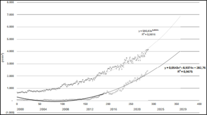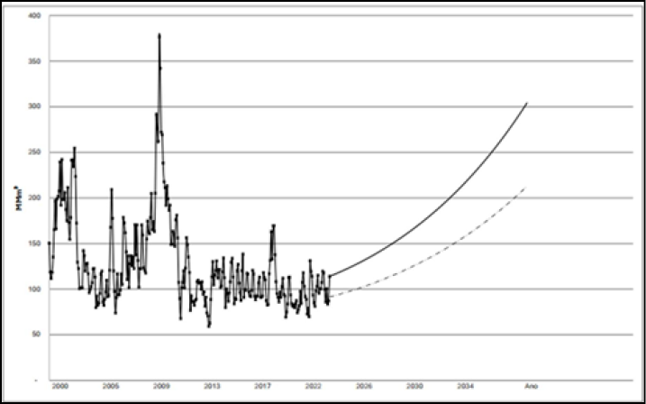 Figure 5 – The three curves are as follows: the historical series curve of NG flaring and loss from 2000 to 2023; the upper continuous curve representing the prediction model of NG flaring and loss if no action is taken; and the lower dashed curve representing the prediction model of NG flaring and loss simulating the increase in the NG utilization rate to feed multiple (fourteen) Hy.GEN 300 processing systems