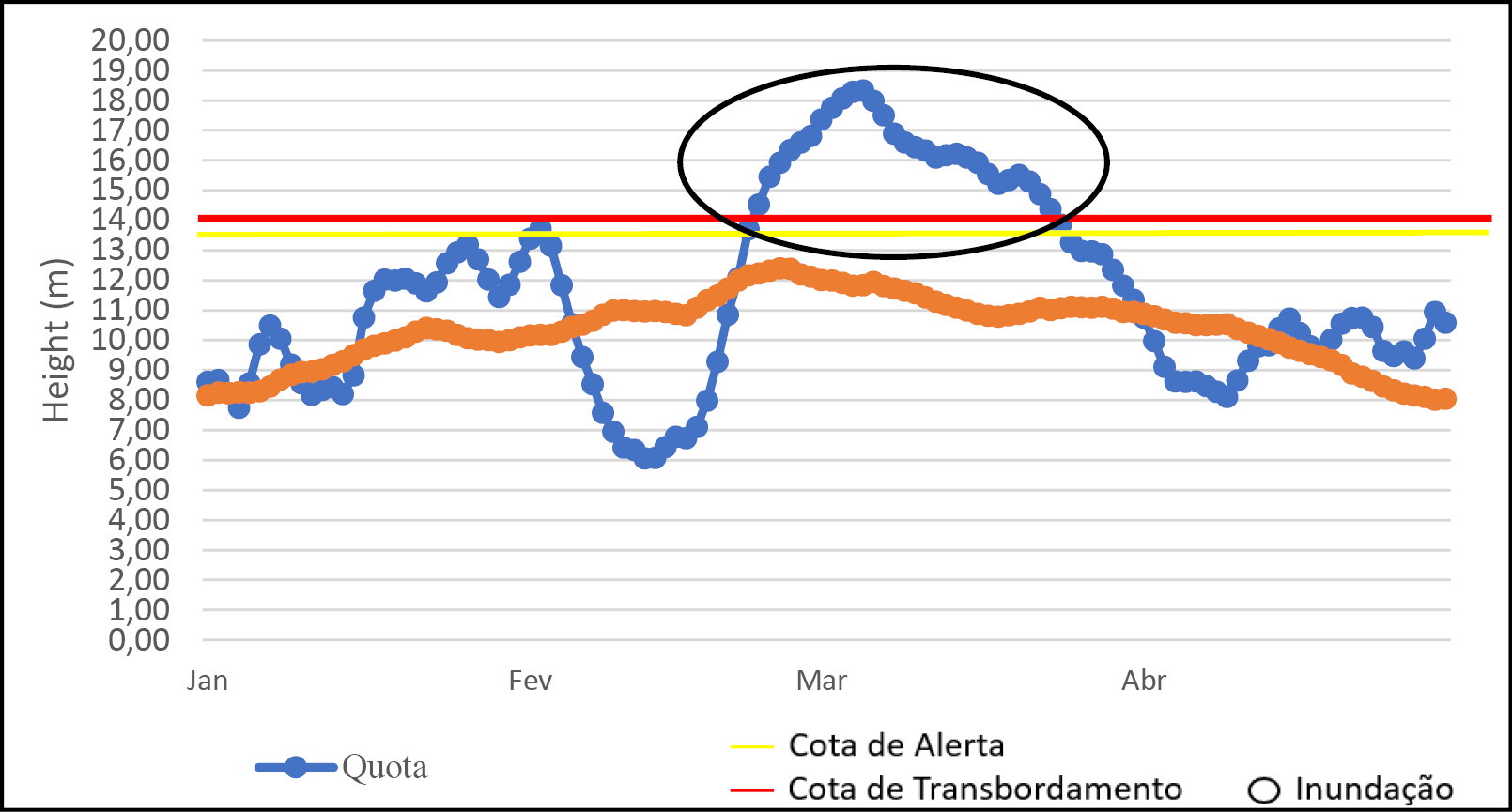 The flood of 2015 was the biggest ever recorded and brought with it severe negative effects, making it a historic milestone for the city of Rio Branco and its population. To begin the analysis of this disaster, Graph 2 shows the level of the Acre River in Rio Branco between January and April of that year.