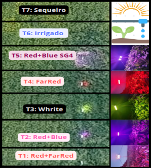 Em função da disponibilidade de apenas uma lâmpada de cada espectro, os tratamentos de iluminação foram aplicados em faixas de 3,15 m (7 linhas) x 2,0 m. Utilizou-se 5 luminárias LED s, sendo estas: Red+FarRed (L1), Red+Blue (2), White (3), FarRed (L4), Red+Blue SG4 (L5). A irrigação foi por um sistema de gotejamento superficial instalado na entrelinha de cultivo, com espaçamento entre emissores de 0,2 m. Assim, os tratamentos avaliados foram: T1 (L1+irrigação), T2 (L2+irrigação), T3 (L3+irrigação), T4 (L4+irrigação), T5 (L5+irrigação), T6 (apenas com irrigação) e T7 (testemunha), conforme ilustra a Figura 1.