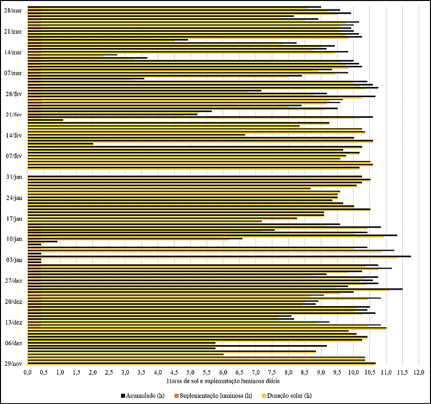 O manejo da suplementação luminosa foi de 25 min de fotoperíodo extra no período compreendido entre v3 a v12/13 (12/12/23 a 15/01/24), uma pausa para soja entrar em floração (R1), após o retorno em 20/02/24 (R5) que perdurou até 01/04/24 (R8), totalizando 32 h de suplementação luminosa no ciclo. Utilizou-se um timer digital temporizador para ligar as lâmpadas diariamente no horário pré-estabelecido em função do fotoperíodo. A Figura 2 apresenta os valores diários de horas de sol e os valores totais com a suplementação luminosa.