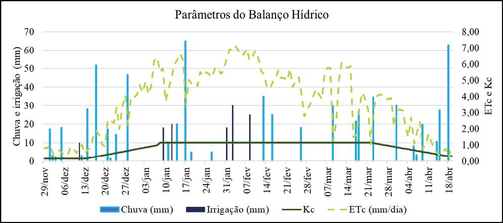 O manejo da irrigação foi igual em todos os tratamentos que receberam irrigação e baseou-se no balanço hídrico do solo, conforme Allen et al. (1998), para manter a capacidade de água disponível (CAD) com a fração de esgotamento de 40%. Os dados meteorológicos apresentados (Figura 2) e os necessários para o cálculo da evapotranspiração de referência (ETo), foram obtidos de uma estação automática (Metos-Brasil), instalada a cerca de 50 m do local do experimento. A evapotranspiração da cultura (ETc), foi obtida pela multiplicação da ETo pelo coeficiente de cultivo (Kc). O cálculo do Kc levou em consideração a fração de cobertura do dossel (Fc), que indica o ponto de inflexão e deflexão na curva do Kc.