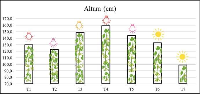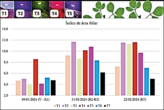 A altura de plantas (Figura 5) foi mais elevada nos tratamentos (T1 a T6) em relação ao T7 (p<0,05). Dentre os tratamentos com suplementação luminosa, os valores mais altos foram no T3, T4 e T5, demonstrando fotomorfogênese distinta em função do espectro luminoso, ou seja, o desenvolvimento da morfologia da planta mediado pela luz, apresentou diferentes comportamentos (Beyi, 2018; Tripathi et al., 2019). Uma das questões importantes nesse estudo, era determinar um manejo da suplementação luminosa que não causasse o estiolamento das plantas de soja. O estiolamento em soja é um problema que ocorre quando as plantas, em busca de luz, alongam seus caules e ramos em excesso, resultando em um crescimento frágil e com pouca ramificação. Nota-se (Figura 5), que o manejo proposto não causou esta problemática, pois as plantas com suplementação luminosa apresentaram alturas bem similares às plantas do T6 (apenas irrigação).