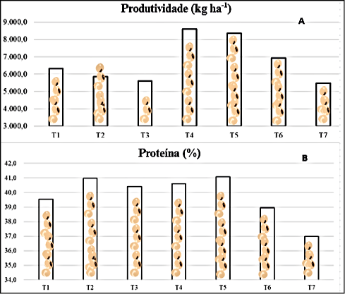 Figura 7 – Produtividade e teor de proteína dos grãos de soja em função dos diferentes tratamentos avaliados