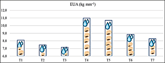 Portanto, a suplementação hídrica e luminosa, além de aumentar a produtividade da cultura e a qualidade dos grãos produzidos com o incremento da proteína (Figura 7), aumentou a EUA (Figura 8), demonstrando ser uma prática de manejo que contribui para uma maior sustentabilidade na produção agrícola. A EUA foi de 7 a 11 kg mm-1, ou seja, de 0,7 a 1,1 kg m-3 (Figura 8), similar ao obtido por Almeida (2021), que obtiveram valores de EUA de 0,6 a 1,2 kg m-1 para níveis de reposição hídrica entre 40 e 120%. Porém, para esses autores, a EUA da soja aumentou à medida que a disponibilidade hídrica no solo foi reduzida. Enquanto, no caso, do presente estudo a EUA foi maior no tratamento com suplementação hídrica e luminosa (T4 e T5), em comparação ao T6 (suplementação hídrica) e T٧ (testemunha). Desmontando que, a luz artificial, além de estimular a fotossíntese, pode melhorar o desenvolvimento do sistema radicular das plantas, permitindo que elas absorvam mais água e nutrientes do solo, contribuindo para um menor consumo de água por unidade de produção.