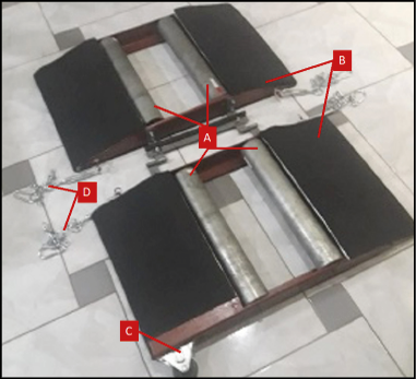 The test bench used is shown in Figure 3. This prototype features a wheelchair tilt system (B), and to maintain the balance of the center of mass, parts F and C serve as adjustments to provide stability for the wheelchair user.