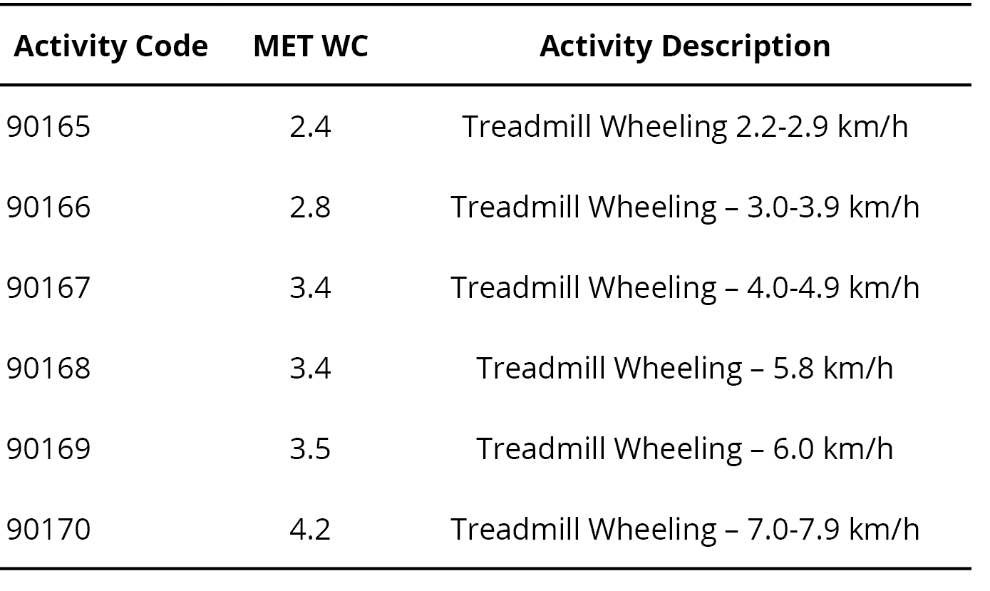 Using data from this compendium, it is possible to determine the MET value for a given activity. For example, the compendium establishes an equivalence value of 1 MET for wheelchair users (MET wc) as 0.992 kcal/kg/h. Based on this, Table 1 presents the energy expenditure of wheelchair propulsion on a treadmill at specific speed ranges.