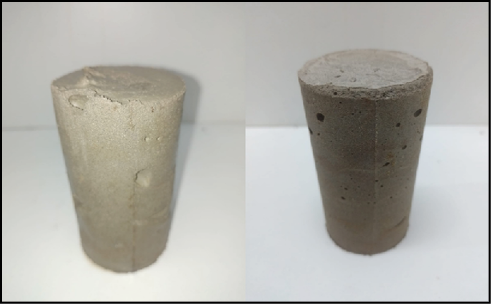 A Figura 4 mostra a pasta cimentícia pronta, com a formulação padrão no lado esquerdo e a pasta contendo nanopartículas de ferro (Fe-NPs) no lado direito.