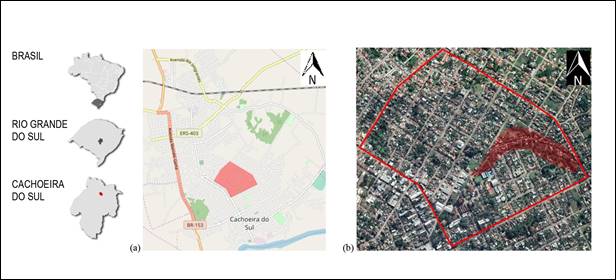 O município de Cachoeira do Sul, localizado na porção central do estado do Rio Grande do Sul, está distante cerca de 200 quilômetros da capital, Porto Alegre. Contando com uma população estimada de 82.201 habitantes (IBGE, 2019), o município tem oficialmente registrados apenas três bairros em todo seu perímetro. No entanto, popularmente, a cidade está subdividida em 55 bairros, delimitados a partir da formação do município e de sua expansão, e decorrente do modo como as famílias passaram a fixar residência e estabelecer seus meios de produção e geração de renda, seja pelo comércio e serviços ou indústria. O recorte a ser analisado localiza-se na porção leste do perímetro urbano do município e compreende espacialmente o limite popular entre dois bairros da cidade: o Rio Branco e o Soares (figura 1a).