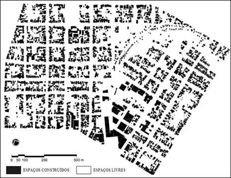 A análise combinada das observações em campo e das imagens orbitais resultou no mapa de figura e fundo apresentado na figura 2. Identifica-se que, de modo geral, as edificações estão localizadas no perímetro externo das quadras, criando miolos livres em seu interior, fato associado à presença dos espaços livres intralote. A partir deste mapa, também se verifica a faixa significativa não edificada presente na porção centro-leste do recorte, local onde antigamente havia a linha férrea, e hoje é ocupado ilegalmente por edificações construídas de modo irregular. A configuração deste local consiste em uma quebra na malha urbana desta porção da cidade, resultante da própria conformação do terreno, o que, associada à característica da ocupação (i.e., irregular e por população de baixa renda), acabou por se tornar uma barreira física e socialmente segregadora[1] que delimita os bairros Soares (a oeste) e Rio Branco (a leste).