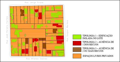 Quanto às tipologias, este quarteirão é composto por 26 lotes que se apresentam em formatos retangulares, com áreas entre 308 m² e 3.155 m². Conforme observa-se na figura 7, cerca de 51% dos lotes apresentam edificações isoladas no lote, 30% apresenta a falta de um dos recuos, 9,5% registram a ausência de dois ou mais recuos e 9,5% dos lotes estão vazios. É importante salientar que, para título de cálculo, foi considerada apenas a edificação principal de cada lote, ou seja, a edificação frontal; porém, analisando a figura 7, identifica-se que boa parte dos lotes apresentam mais de uma edificação que, em alguns casos, se caracterizam como salões de festas, quiosques, anexos, entre outros. Tais construções secundárias não seguem a mesma tipologia da edificação principal, havendo, assim, incidência de tipologias isoladas no lote ao fundo, ou com a ausência de um ou dois recuos laterais.