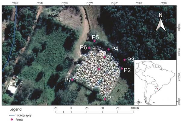 A total of 18 soil samples were collected in 9 points distributed through the cemetery. The sampling in each of the points was performed in two distinct depth profiles, in 0 - 0.2 m (top) and 0.2 - 0.4 m (base). The distribution of the sampled points took into account variables such as: terrain slope and visibly critical points (Figure 2). Each of the samples was packaged in polyethylene packaging at an approximate volume of 200 grams. All samples were preserved and left to dry at room temperature for three days in polypropylene molds according to the criteria of Embrapa (2006).