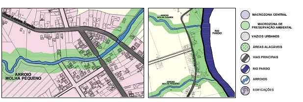 Figura 6 – Recortes do Mapa da Sede Urbana: Perímetro Urbano e Macrozoneamentos, componente do Plano Diretor do município de Candelária, em que já constavam edificações construídas nas APPs do Rio Pardo e dos arroios existentes na área urbana do município