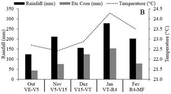 Figure 1 – Rainfall (mm), evapotranspiration (Etc) and temperature (ºC) at the development stages of corn crop, in harvests 2013/2014 (A) and 2014/2015 (B)