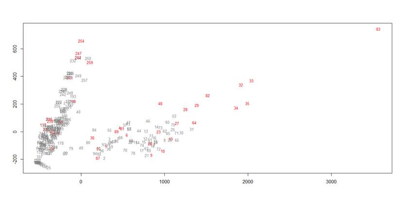 Figure 2 – Adjusted quantile plot showing the outliers detected by the 97.5% quantile of the chi-square distribution 10 degrees of freedom, using 99% of the observations for the MCD estimations, and a maximum thresholding proportion of 0.05. The grey numbers represent the non-outlier observations and the red numbers represent the outlier observations