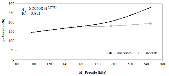Pela relação vazão-pressão ajustada aos dados observados na Figura 4, conforme o modelo potencial da Eq.1, observa-se que o valor do expoente da pressão (H) permite identificar o microaspersor como do tipo turbulento, pela proximidade de seu valor a 0,5 (FRIZZONE, REZENDE e FARIA, 2012; KELLER e BLIESNER, 1990). Por isso, as variações de pressão de operação influenciam na vazão do emissor. Em algumas situações, observa-se no campo a expansão na quantidade de emissores pelo aumento da área irrigada, porém operando com mesma bomba, resultando em menor pressão de operação, podendo haver menor uniformidade de distribuição de água na área. A maioria dos emissores comercializados são do tipo turbulento, por isso o projetista deve dispor da equação de ajuste manter a vazão dentro dos limites de variação desejados, normalmente 10% (BERNARDO, SOARES e MANTOVANI, 2006).