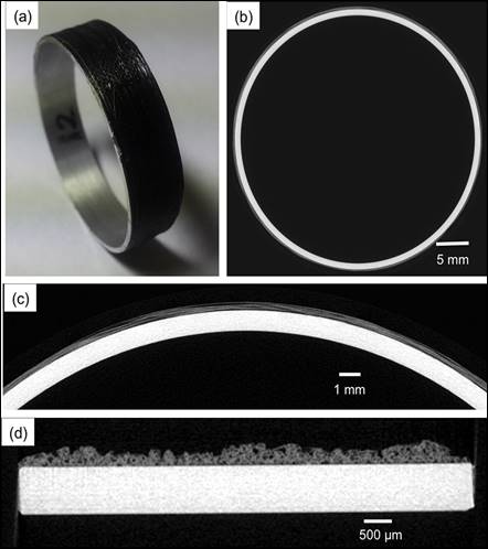 Figura 2 – (a) Fotografia de um fio Epon 828 / NC (66 voltas) envolto em anel Al. Imagens de NC relacionadas do CCOAR foram reconstruídas paralelamente a (b e c) a direção do enrolamento do NC e (d) corte transversal da direção do arco. (c) é uma seção ampliada de (b). As resoluções espaciais são 20,7 μm em (b) e (c) e 5,3 μm em (d), respectivamente(Kim et al., 2016) (figura adaptada)
