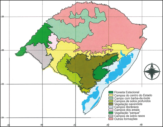 The southernmost fields of Brazil, also known as subtropical fields, cross the geographical border and extend to Argentina and Uruguay. In Brazil, they are part of Campos Sulinos (Southern Fields), a term used for the fields of the states of Rio Grande do Sul (RS), Santa Catarina (SC) and Paraná (PR). The Brazilian Institute of Geography and Statistics (IBGE, 2004) classifies the Brazilian vegetation with respect to biomes. In this proposal, Campos Sulinos, of different phytophysiognomies, are distributed in the Pampa and Atlantic Forest biomes. The Brazilian Pampa is restricted to RS, occurring in the southern and western half of the state and covering an area of 176,496 km², corresponding to 63% of the state territory and 2.07% of the Brazilian territory (IBGE, 2004). It corresponds to the largest temperate natural grassland area in the world (BILENCA; MIÑARRO, 2004). This formation comprises a set of very old ecosystems with their own fauna and flora, great biodiversity, and a considerable genetic heritage, rarely found in other pastoral ecosystems of the planet (QUADROS et al., 2009; VALLS et al., 2009). In addition, species spread through the Pampa fields of Argentina and Uruguay (BOLDRINI, 2009).