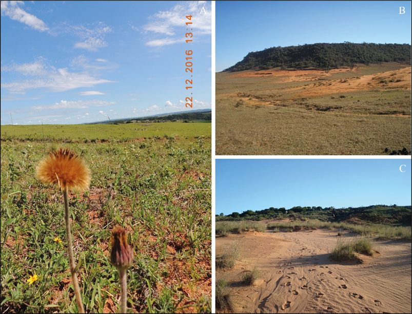 Figure 2 – Campos dos Areais. A. Grazed field area without arenization, although the soil is exposed; São Francisco de Assis city, near BR 377 (29°35'35.91''S and 55º09'11.80''W); B. Sandy field area in Cerro da Esquina, São Francisco de Assis city (29°31'07.32''S and 55º07'40.31''W); C. Ungrazed sandy field area in Cerro do Tigre, Alegrete city (29°39'32.42''S and 55º24'04.10''W)