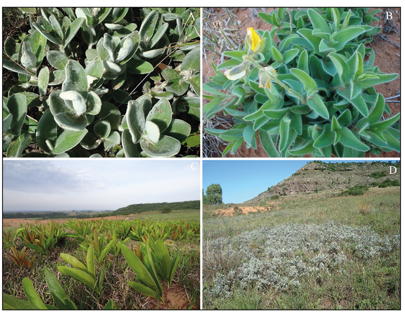 Figure 3 – Species recorded in Campos dos Areais. A. Gochnatia cordata Less. (endangered). B. Specimen of Crotalaria tweediana Benth. C. Population of Eugenia arenosa Mattos in a sandy native field in Jacaquá, São Francisco de Assis city. D. Psidium salutare var. sericeum (Cambess.) Landrum. population in a native field area in Cerro do Tigre, Alegrete city