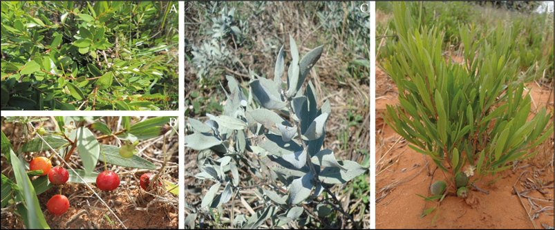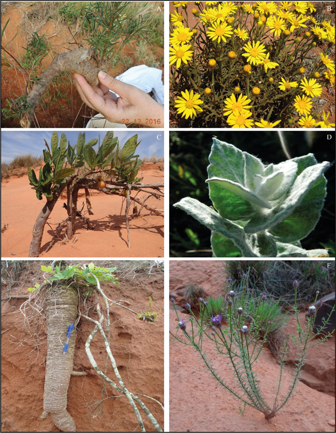 In most species, adaptive characteristics are xeromorphic, among which stand out the occurrence of leathery leaves, with varied shapes and positions; dense hairiness; presence of essential oils; and thickened underground organs (Fig. 5A-F) (FREITAS, 2010; BOLDRINI et al., 2010). In the study by Freitas (2010), 89.5% of the species recorded for Campos dos Areais presented one or more adaptations to stress factors, with leaf adaptations and the development of underground organs being the most frequent strategies. Among leaf characteristics, short or absent petiole and reduced leaf area were the most frequent, although the presence of hairiness was also recurrent. Among underground systems, deep roots and the presence of xylopodium were the most frequent.