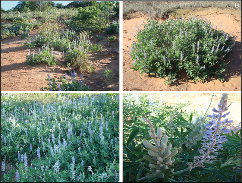 The great diversity of species with forage potential in the Pampa fields, coexisting with summer and hibernal grasses, makes them particularly suitable for livestock. When properly managed, they provide a high-quality and varied natural diet, producing meat with highly appreciated and differentiated sensory and nutritional characteristics (BEHLING et al., 2009). Among the species with forage potential are Paspalum notatum Flüggé (bahia grass), Paspalum dilatatum Poir (dallis grass), and Axonopus affinis Chase (carpet grass). To these can be added Fabaceae species that, in addition to having forage potential, promote natural fertilization of fields and can be used to recover degraded areas in regions where their occurrence is natural (BENCKE, 2016), as is the case of Lupinus albescens Hook. & Arn. (Fig. 7A-D) (ROVEDDER et al., 2009).