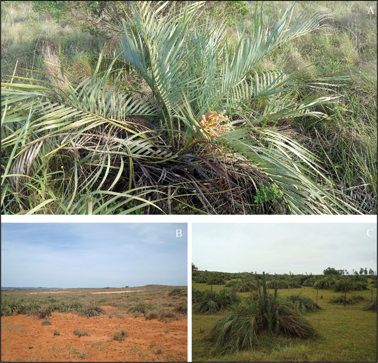 Figure 8 – A. Specimen of Butia lallemantii Deble & Marchiori photographed at Cerro do Tigre, Alegrete city; B. Species population in a sandy field in São Francisco de Assis city, near BR 377; C. Species population in a native field area with lower incidence of sanding in Taquari, São Francisco de Assis city