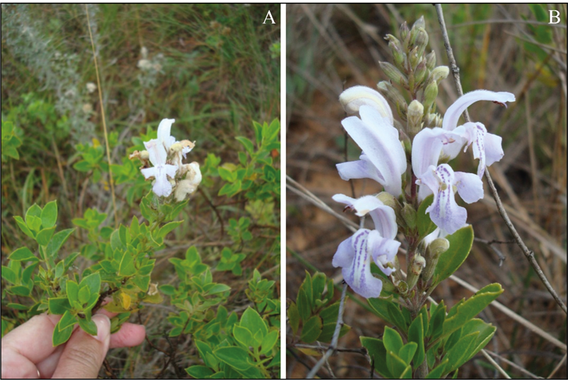 Figure 9 – A. Hesperozygis ringens (Benth.) Epling (Lamiaceae) population sandy fields; B. Inflorescence detail