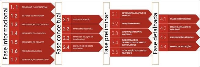 Assim, detalhando o macroprocesso de desenvolvimento, na fase do projeto informacional tem-se o arrolamento das informações necessárias sobre o projeto. Nesta etapa, além de interpretar as informações, segundo Romeiro et al. (2009) é onde se decompõe a saída da fase anterior em especificação do projeto, além de detalhar os requisitos do produto. Em seguida, têm-se o desenvolvimento da fase de projeto conceitual, onde são feitas as descrições (modelagens) das funções que o produto precisa proporcionar, sem levar em consideração como tais funções serão estruturadas; para que em seguida possam ser propostas as soluções possíveis para as funções do produto e realizado o arranjo esquemático do produto. A fase é finalizada pela busca da forma geométrica e estética do respectivo produto. Na fase de projeto detalhado são desenvolvidos os testes necessários, criação de material de suporte, os processos de fabricação do produto e providenciada a documentação e a homologação do produto. Essencialmente, esta fase possui três ciclos: ciclo de detalhamento, onde será criado e detalhado sistemas e componentes, o ciclo de aquisição, contemplando o desenvolvimento de fornecedores e o ciclo de otimização, onde avalia-se os sistemas e componentes para a configuração e documentação dos processos e dos produto. Concomitantemente à fase de detalhamento, acontece a fase de preparação da produção onde os recursos são mobilizados, onde são desenvolvidos os manuais do produto e também de instruções para assistência técnica e informações para os vendedores. É nesta fase ainda que ocorre a produção de um lote piloto (ou pré-série).