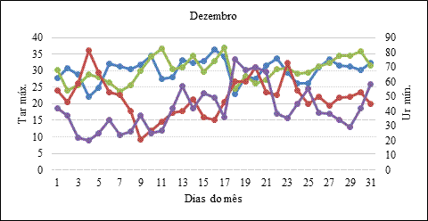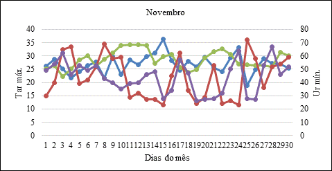 Figura 3 – Temperatura do ar máxima e umidade relativa mínima do ar para os meses de novembro, dezembro e janeiros das séries de dados 2017/18 e 2018/19