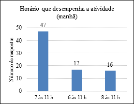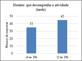 Em relação ao turno de execução das atividades relacionadas a colheita, 47 responderam que trabalham das 7:00 às 11:00 h e das 15:00 às 19:00 h, nos períodos matutino e vespertino, respectivamente. Observa-se a Figura 5.