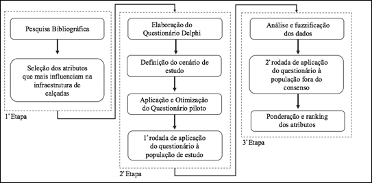 Para o cumprimento do objetivo da pesquisa foi necessário obter uma fundamentação técnico–teórica para o levantamento dos atributos que mais influenciam na infraestrutura de calçadas. Essa etapa foi conduzida por meio de uma revisão da literatura especializada sobre o assunto nos Portais de Periódicos da Capes e Web of Science e foi apresentada no capítulo 2 do presente artigo. A partir da seleção dos atributos foi elaborado um instrumento de pesquisa no formato de um questionário semiaberto contendo questões fechadas, para determinar o grau de importância de cada atributo, e um questionamento aberto, para indicação de outros atributos não listados.