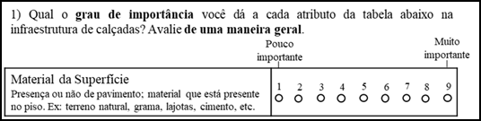 O julgamento dos atributos por meio da determinação do grau de importância foi estabelecido pelo respondente através de uma escala Likert de nove pontos, conforme o recorte do instrumento de pesquisa apresentado na Figura 2.