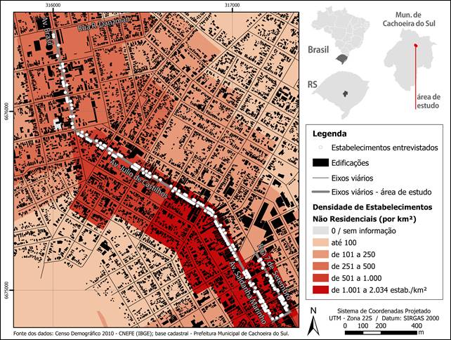 Considerando que o objetivo da pesquisa é a geração de um ranking com a importância relativa dos atributos selecionados, foi importante definir adequadamente o cenário de estudos a fim de garantir representatividade e consistência nas respostas. Nesse sentido, sabe-se que a presença de comércios e serviços é um dos fatores mais estimulantes para a caminhada (BRADSHAW, 1993; OESTREICH et al., 2018), vista a atratividade do ambiente e as condições de infraestrutura. Diante disso, o cenário de estudo determinado foi a região central da cidade de Cachoeira do Sul, localizada no centro do Estado do Rio Grande do Sul e classificada como uma cidade de pequeno porte, com 82.547 habitantes, segundo o Instituto Brasileiro de Geografia e Estatística (2018). A área selecionada para aplicação do questionário apresenta grande concentração de estabelecimentos comerciais e de serviços em suas quatro principais vias, conforme mostra a Figura 3.