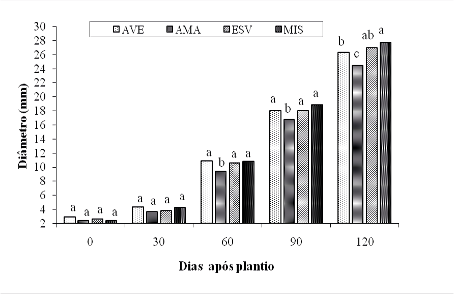 O crescimento em diâmetro não variou entre classes até os 90 dias de plantio em campo. Foram registradas diferenças significativas apenas aos 120 dias, em que a classe Avermelhada apresentou crescimento inferior às demais, sendo consistente com o seu crescimento em altura.