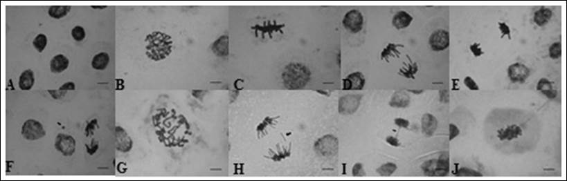 Em que: A: intérfase; B: prófase; C: metáfase; D: anáfase; E: telófase F: micronúcleos; G: C-metásese; H: cromossomo perdido; I: pontes cromossômicas, J: cromossomos pegajosos.