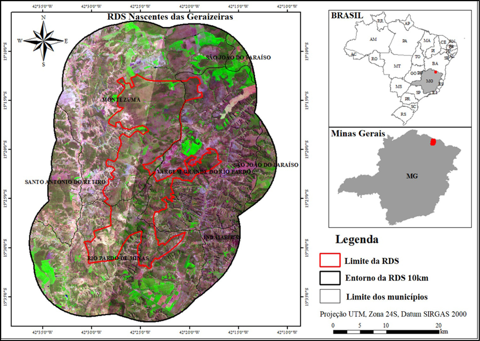 A RDS-NG está geograficamente situada nas coordenadas 15º30’ de latitude Sul e 42º40’ de longitude Oeste, no norte de Minas Gerais. A área possui, como componente principal da flora, o bioma Cerrado em suas várias fisionomias. No presente estudo de uso e ocupação do solo foi adotada uma zona de 10 km no entorno do limite legal da RDS-NG, abrangendo um adicional de 155.459 hectares, que envolve uma área mais ampla do que a distância mínima de 3 km definida pela Resolução do Conselho Nacional do Meio Ambiente (CONAMA) nº 428/10, de 17 de dezembro de 2010 (BRASIL, 2010) como zona de amortecimento para Unidades de Conservação sem plano de manejo. Optou-se por uma zona de 10 km no entorno da Reserva para captar de forma mais ampla os efeitos da fragmentação e a integridade da paisagem no entorno que afetam o interior da RDS-NG. Com isso, o presente estudo (RDS + zona de 10 km no entorno) envolveu uma área total de 193.636 hectares (Figura 1).